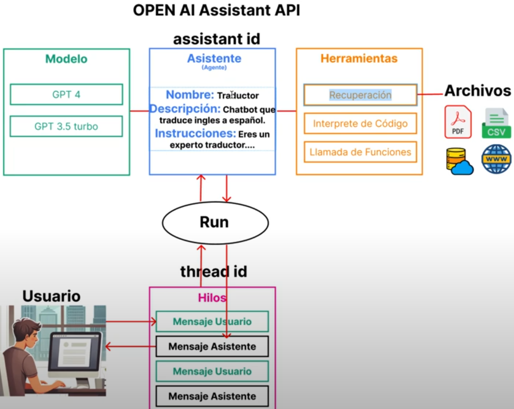 En esa figura, observamos los siguientes componentes que pueden configurar el assitants de OpenAi: