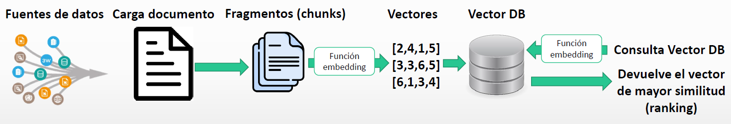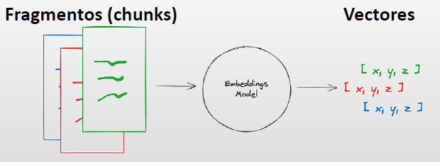 Estos fragmentos servirán más adelante además como componentes útiles en forma de vectores a partir de una incrustación (embeddings ), que luego podremos buscar utilizando una similitud de distancia más adelante. Por ejemplo, si queremos alimentar un LLM con contexto adicional para que sirva como chatbot de preguntas y respuestas, si tenemos varios vectores guardados cada uno con una información diferente, la búsqueda será más rápida puesto que se hará un cálculo del vector guardado que tiene mayor similaridad en lugar de buscar en todos los datos globales.
