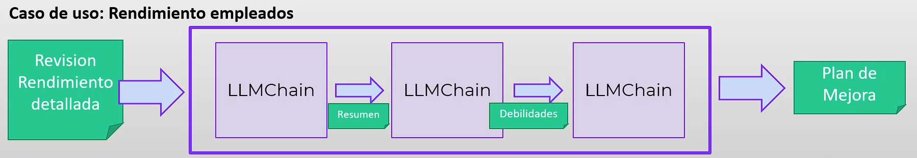Imaginemos que estamos en el departamento de recursos humanos y queremos hacer un plan de mejora para todas las funciones que tiene cada uno de los empleados de la empresa. Lo que tendremos de partida es una revisión del rendimiento del empleado y vamos a considerar un modelo secuencial completo. En el primer bloque de LLMcahin, se va a especializar en obtener un resumen a partir de la revisión que tenemos como entrada, el siguiente bloque va a estar especializado en detectar las debilidades a partir del resumen anterior y por último se nos va a proporcionar un plan de mejora basándose en las debilidades que se han detectado. Esto se hará para todos los empleados de la plantilla de una manera casi totalmente automática.